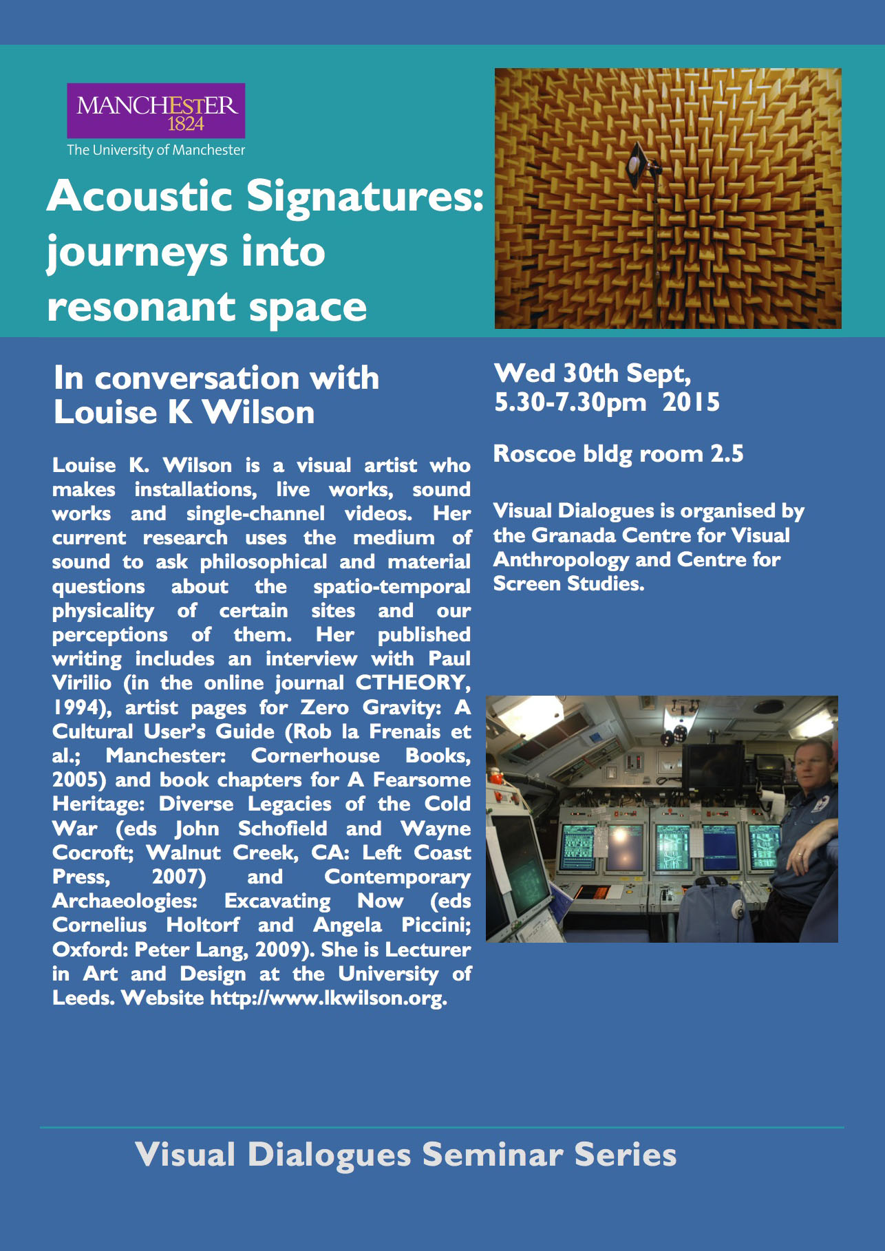 Visual artist Louise K. Wilson will present her work on Wednesday 30 September 2015, from 5:30 to 7:30pm. The event, which will take place in the Roscoe Building room 2.5, is part of Visual Dialogues, a series organised by the Granada Centre for Visual Anthropology and the Centre for Screen Studies at the University of Manchester. All welcome!