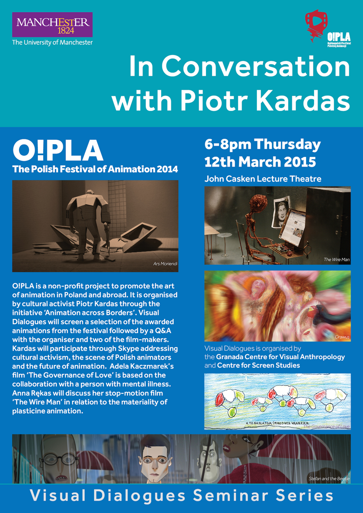For the series Visual Dialogues, we are proud to host an evening on the Polish Festival of Animation O!PLA. On Thursday 12th of March in the John Casken lecture theatre, Martin Harris building a the University of Manchester, from 6 to 8pm we will screen a selection of animated films and talk to the organiser Piotr Kardas, who will be connected live.