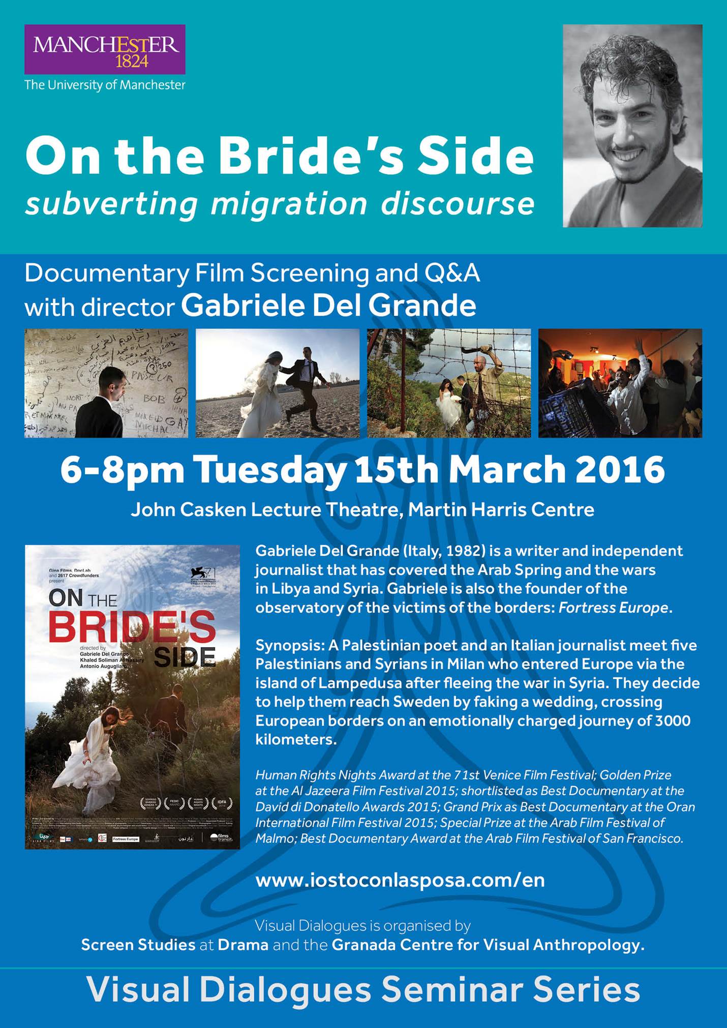 We would like to invite you to the upcoming Visual Dialogues screening and Q&A organised by Screen Studies at Drama and the Granada Centre for Visual Anthropology. We will be screening the Italian documentary film On the Bride’s Side (2014). The film deals with the Syrian refugee crisis and it will be followed by a conversation with the director Gabriele Del Grande and co-producer Alexandra D’Onofrio (PhD candidate in Anthropology, Media and Performance).