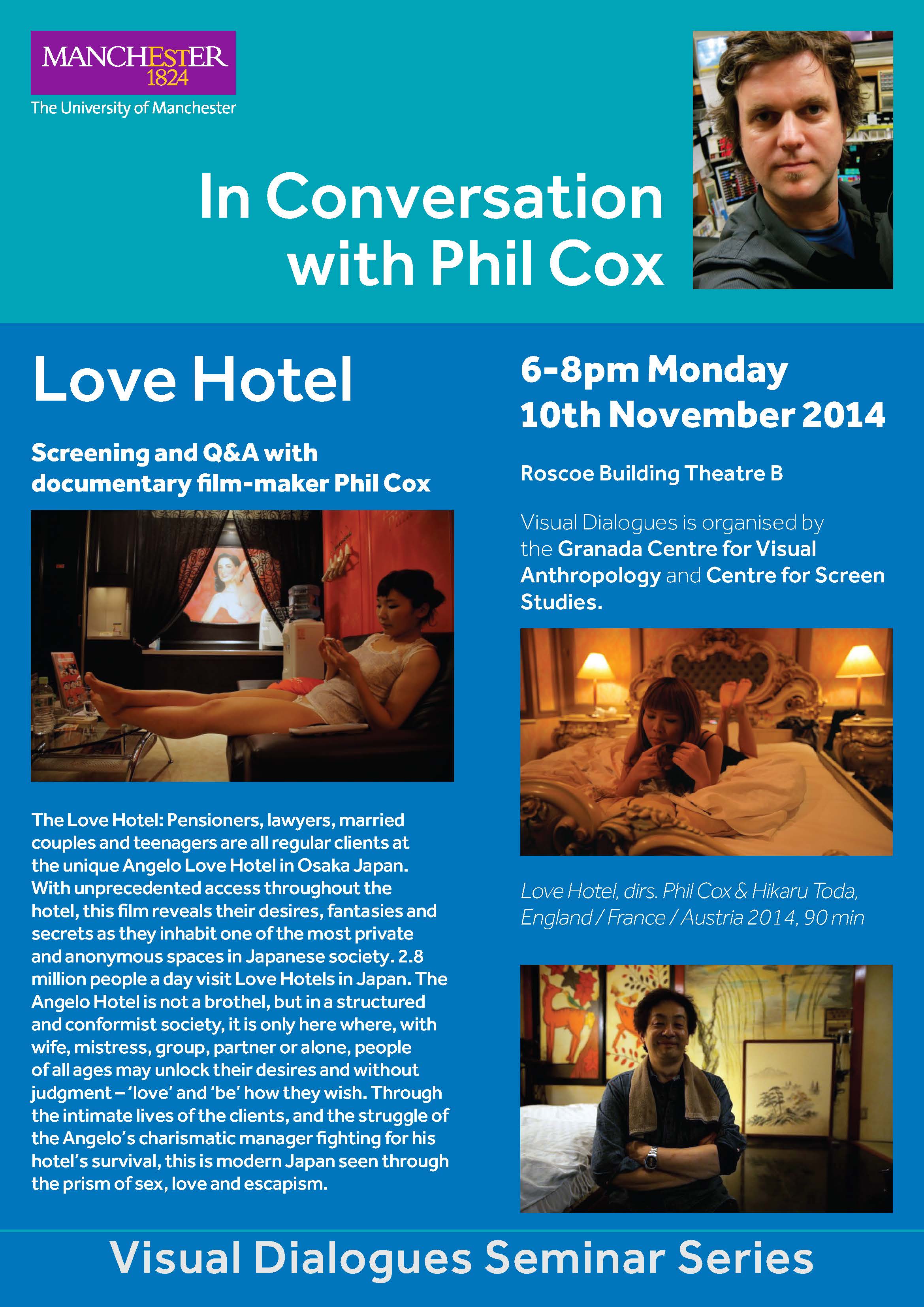 We are happy to announce the screening of Phil Cox’s award-winning documentary “Love Hotel” on Monday 10 November at 6pm. The director will be present for a Q and A session. The event, taking place in Roscoe Theatre B, is hosted by the Granada Centre for Visual Anthropology and the Centre for Screen Studies.